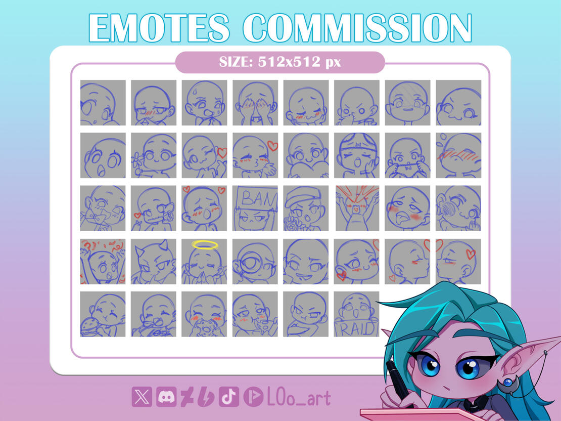 Chibi style. Please tell me: your description character (hair color, clothes, eye color etc) or send me a reference picture of your character (if there one) , expression: (repeat this for every emote; descriptions are accepted but I would appreciate visual references for easier understanding)SIZE: 512x512 px for Discord/Twitch/whatever resized versions- $15 per 1 emote